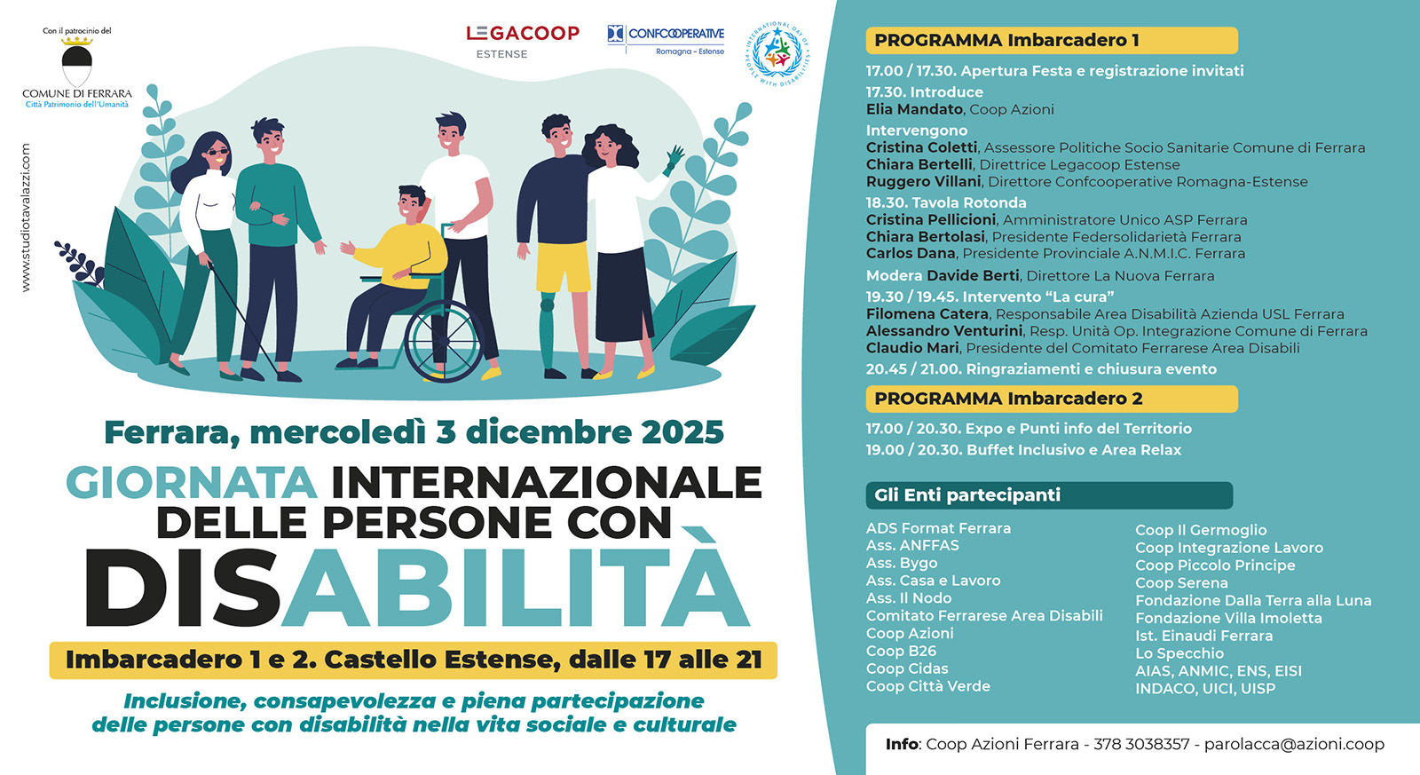 L’iniziativa, organizzata dalla Cooperativa Sociale Azioni e realizzata in collaborazione con Confcooperative Romagna-Estense, Legacoop Estense e con il patrocinio del Comune di Ferrara, si svolgerà presso l’Imbarcadero 1 e 2 dalle ore 17:00 alle ore 21:00. L’evento di Ferrara, mira a dare un contributo concreto a livello locale promuovendo una cultura di piena partecipazione, per far diventare il nostro un territorio ancora più accogliente. L’iniziativa è volta a promuovere un momento di riflessione e confronto, coinvolgendo istituzioni, associazioni e cittadini.